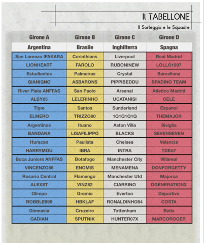 DI QUELLO IN MAGLIA GIALLA NON MI FIDO AFFATTO. ah ah ah ah eRA TUTTO PILOTATO. IL MILANISTA GUARDAVA SPUDOIRATAMENTE E SE NON ERA PER LA VOCE FUORICAMPO A FRENARE QUEL BEPPO VENIVANO FUORI COSE TURCHE!!AH AH AH Ovviamente si scherza,ma quando Beppo ha parlato di carabinieri appena ha estratto Costa mi sono preoccupato un po' visto quello che sta' succedendo nel calcio!ah ah ah Venendo al sorteggio,girone argentino da paura stando ai nomi sorteggiati visto che ci sono ben 7 organizzatori "attenti" su fantaclub,sara' un successo che vale una lega di primo livello riuscire a primeggiare.