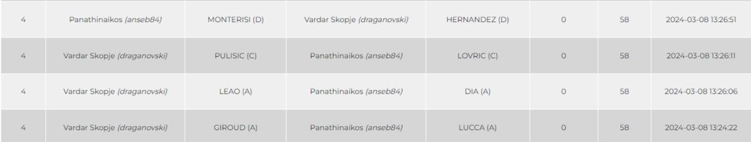 Viene pertanto considerato irregolare lo scambio effettuato in data 8 Marzo tra Vardar Skopjie e Panatinaikos che ha coinvolto Theo Hernandez-Pulisic-Leao-Giroud in cambio di Monterisi-Lovric-Lucca-Dia in favore della prima squadra e del quale le due squadre hanno usufruito nella giornata n°26 di lega.