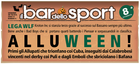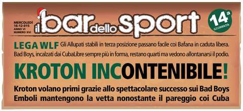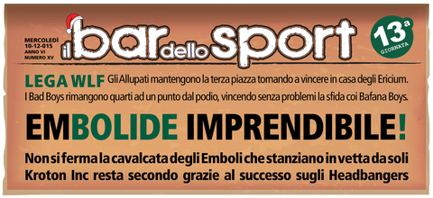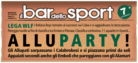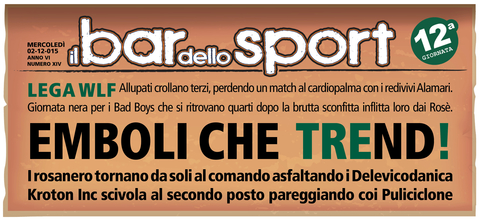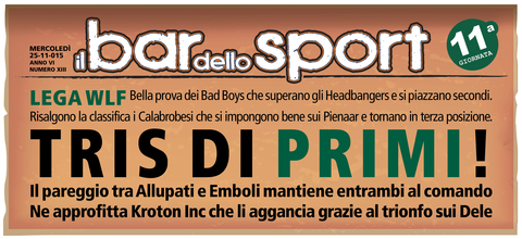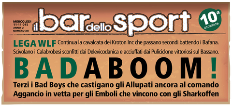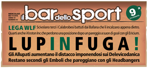 Questo campionato si WLF si fa sempre più avvincente. Da una parte per la classifica terribilmente corta e dall'altra per la mancanza di una vera mattatrice come è sempre accaduto nelle scorse edizioni. Infatti gli Allupati rimangono capolista nonostante la dura sconfitta subita in casa dai Bad Boys che grazie ai tre punti si riportano appena sotto il podio. Tornano alla vittoria gli Emboli che agganciano la vetta superando senza troppa difficoltà gli Sharkoffen troppo altalenanti in questa prima parte di stagione e rilegati nelle ultime posizioni di classifica. Non si ferma neppure la strisci...