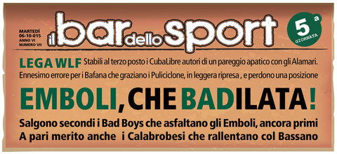 Dopo cinque giornate la LegaWLF ha nuovo leader. Grazie a una partita magistrale i Calabrobesi vanno a vincere in trasferta lo scontro diretto con i Bad Boys, a cui va dato il merito di aver dato il massimo, e si vanno a piazzare capolista solitaria, grazie anche alla sorprendente sconfitta inflitta agli Emboli dai Rosè. Proprio la neoarrivata ottiene il primo successo, travolgendo la formazione rosanero, che scivola seconda, e abbandonado così la casacca dell'ultimo posto.