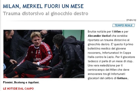 Da fonti Sky ieri sera ho sentito che Merkel dovra' stare fermo 2 mesi e comunque quando sara' pronto rientreranno anche Aquilani e Boateng per cui servira' a poco.Pasquato sembra che,con quell'assist che ha dato il pareggio allo scadere a Fufi Team non facendolo giocare in 10 (ih ih ih ih),abbia convinto il Torino a prenderlo quindi sembra giochera' in B. Ecco come si decide,forzatamente come fare i cambi......E Sabino,questo rientra nel discorso dell'altro giorno,aveva ragione quando diceva che i cambi vanno dosati,ma e' anche vero che come dicevo io adesso Pasquato porta via 2 cambi e non 1...
