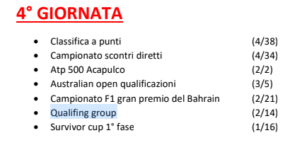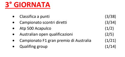 Partirà poi questa settimana il campionato F1 con il primo appuntamento del GP Australia. Per il campionato F1 le squadre sono state divise in 7 gironi e per ogni giornata in cui si disputa il GP riceveranno determinati punti in base alla posizione di giornata. Nelle info della lega trovate il dettaglio dell'assegnazione punti in base...