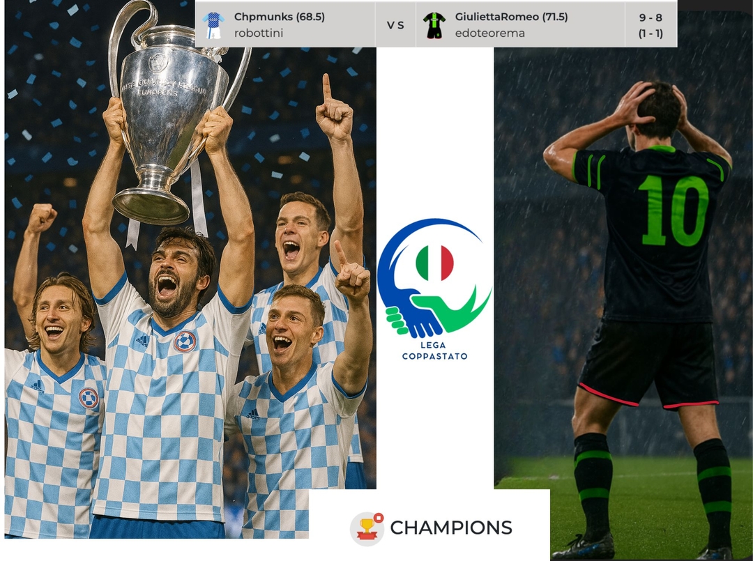 Settimana d'oro per la Giuliettaromeo, che vince la Coppa Nazionale con un clamoroso 6-1 ai danni di Lancidrea e scavalca Invictus prendendo provvisoriamente la testa della classifica in campionato. Il modo migliore per scordare i maledetti rigori della finale di Champions.