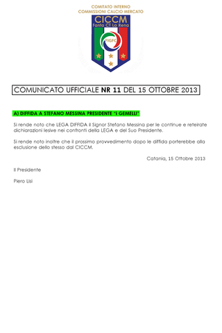 A) DIFFIDA A STEFANO MESSINA PRESIDENTE "i GEMELLI"