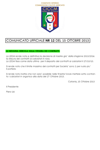 La LEGA fissa come data ultima per il deposito dei contratti ai calciatori il 27/10/13.
