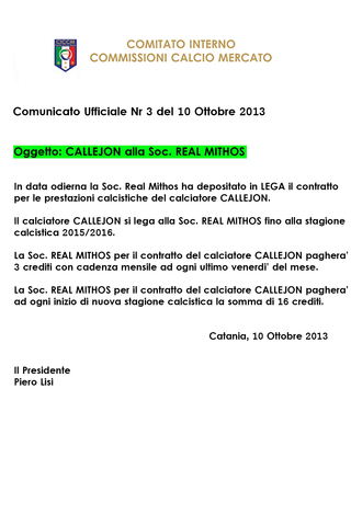 La Soc. REAL MITHOS per il contratto del calciatore CALLEJON pagherà