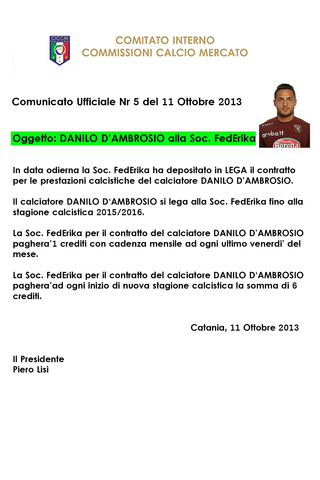 La Soc. FedErika per il contratto del calciatore D'AMBROSIO pagheraà