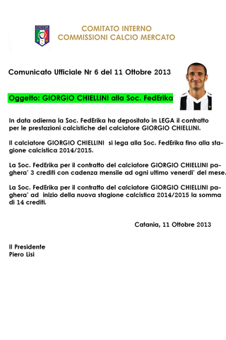 La Soc. FedErika per il contratto del calciatore GIORGIO CHIELLINI pagherà ad inizio della nuova stagione calcistica 2014/2015 la so...