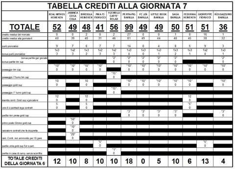 TABELLA CREDITI E BONUS AGGIORNATA ALLA GIORNATA 7