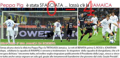 Le reti di BENATIA prima G. ROSSI e JONATHAN dopo, asfaltano la squadra di RAVAPIG e servono a testimoniare lo strapotere della squadra di dongiuliano, che a fine gara dichiara: "vinceremo tutto, ed inoltre voglio ringraziare publicamente il Presidente della Lega...riesco a vincere tutto anche senza segnare un solo gol, grazie alle innumerovoli bandierine che piovono dal cielo. Grazie Presidè".