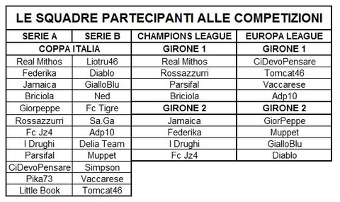 BRICIOLA 6, JAMAICA 4, REAL MITHOS 3, PARSIFAL 3, PIKA73 3, GIORPEPPE 3, ROSSAZZURRI 3, FC JZ4 3, I DRUGHI 3, FEDERIKA 3, LITTLE BOOK 0, CIDEVOPENSARE 0