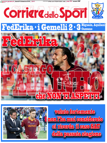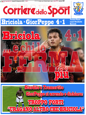 Perdere al 90' non è ne facile ne bello da accettare. Assorbiamo la sconfitta ed andiamo avanti. Mi assumo le mie responsabilità e chiedo scusa alla piazza. Fino all'ultimo ho tenuto in ballottaggio RADOVANOVIC con KHRIN e PAULINHO con CASSANO, avessi scelto per l'uno o per l'altro avremmo commentato un altra partita. Pazienza mea culpa ma un sassolino me lo tolgo, ci criticano tutti, andata a guardare la classifica pt generale, davanti abbiamo solo il tritatutto dongiuliano e Briciola, non siamo proprio messi male.