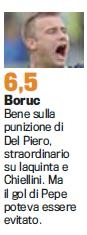 Secondo me è ingiusto il voto aldilà dei goal che ha preso e come dice qualcuno , siccome si chiama Boruc e gioca nella fiorentina ha preso solo 6,5, assurdo. Oggi ha segnato Krasic quanto vi scommetete che domani la gazzetta gli attribuirà almeno 7,5 per il goal fatto ( e per l'ammonizione presa)?