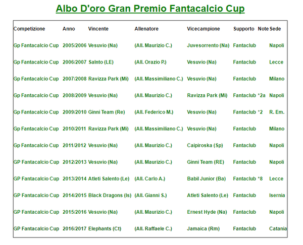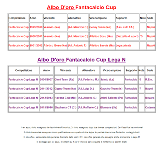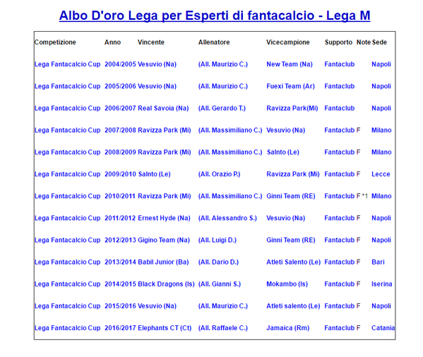 Un grazie particolare a Marco, che da oggi ha reso più dinamica la gestione dell'albo d'oro. E' ora più facile collegare tra loro le annate storiche delle leghe. La Lega per esperti, tramite il menù avanzato, può ora fornire in modo diretto le stagioni in data base. La prima annata disponibile è quella del 2007. Per le annate precedenti su fantaclub, ovvero quelle tra il 2004 e il 2007, non sono disponibili dati diretti ma solo i report. Sono invece rintracciabili tramite i dati storici di Fantaclub le annate di Lega N, degli Europei e dell'Intercup