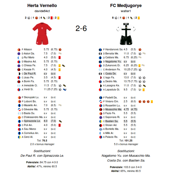 Redazione MILANO mancata ammonizione a BARELLA e MAGNANELLI errata attribuzione a MISSIROLI - FANTACALCIAMO mancata attribuzione a BELEC, LOMBARDI e Alex S. errata a BARZAGLI ricalcolate le leghe interessate con il relativo parametro a SI