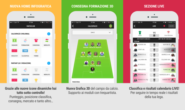 - Nuova sezione Home con i menu di lega: grazie al design delle icone hai subito sott'occhio punteggio ultima giornata, stima live punteggio giornata corrente, posizione attuale in classifica, indicazione consegna effettuata, apertura mercato e tanto altro.