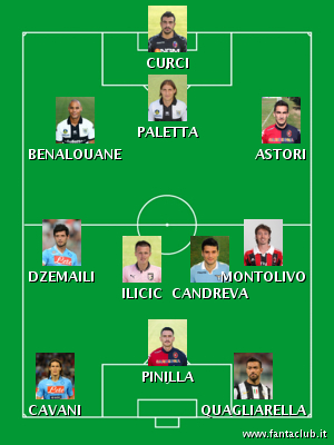 curci (10.5), benalouane (9.5), paletta (9.5), astori (7.0), dzemaili (17.5), ilicic (11.0), candreva (10.0), montolivo (10.0), cavani (13.5), pinilla (13.5), quagliarella (11.5).