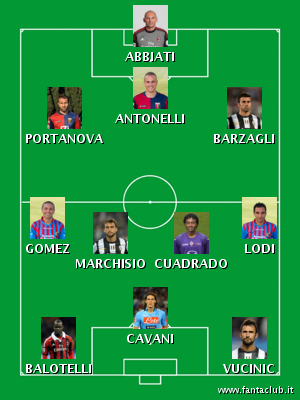 abbiati (6.5), portanova (9.0), antonelli (8.0), barzagli (7.0), gomez (13.5), marchisio (11.0), cuadrado (10.0), lodi (10.0), balotelli (13.5), cavani (13.5), vucinic (11.5).