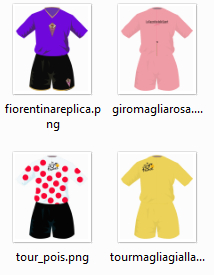 sono state aggiunte altre magliette tra quelle a disposizione: maglia storica fiorentina con pantaloncini neri, piu' tre magliette dedicate al ciclismo: maglia a pois, maglia gialla e maglia rosa.