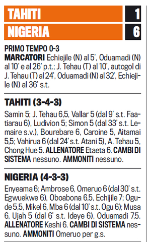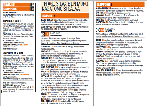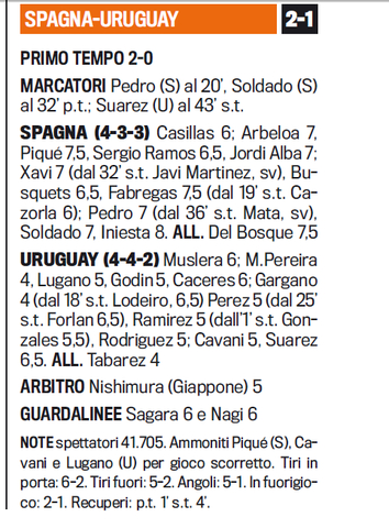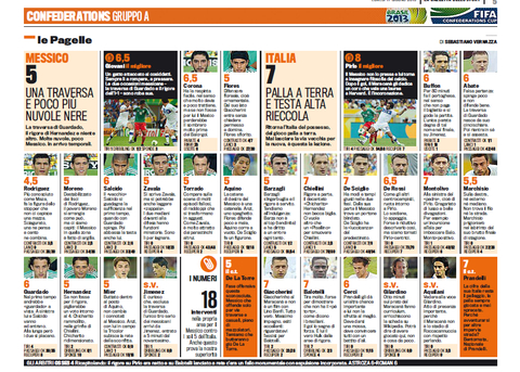 Qui c'e' il tabellino di Messico-Italia! http://i43.tinypic.com/2k4m5h.jpg Ps:Nicandro sul giornale i voti non ci sono perche' la partita si e' giocata stanotte.Credo dovremo aspettare il giornale di domani!