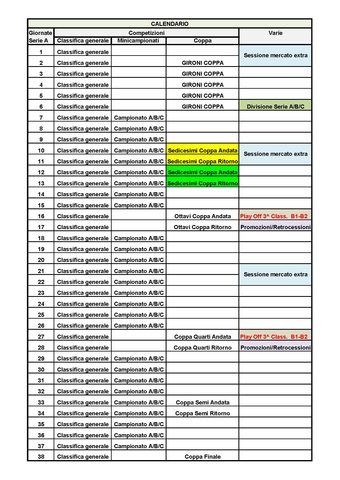 Pubblicato il calendario della stagione 2014-15 (competizioni, mercato, promozioni/retrocessioni). La seconda sessione di mercato extra capiterà a cavallo della chiusura del mercato invernale di serie A (02/02/2015). Dalla prossima giornata partirà la coppa ed a breve saranno creati i gironi con i calendari degli scontri diretti. I gironi saranno creati in base alla classifica generale della prima giornata.