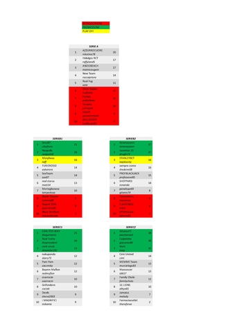 E' terminato il campionato di apertura. Vi ricordo che retrocedono le ultime 5 della serie A; le ultime 3 della serie B1 e B2; mentre saranno promosse le prime 2 della serie B1 e B2 e le prime 3 della serie C1 e C2; Inoltre ci sarà lo scontro Play Off tra la 3^ B1 (Morpheus) e la 3^ B2 (Stanleybet) per l'ultimo posto disponibile in serie A.