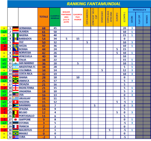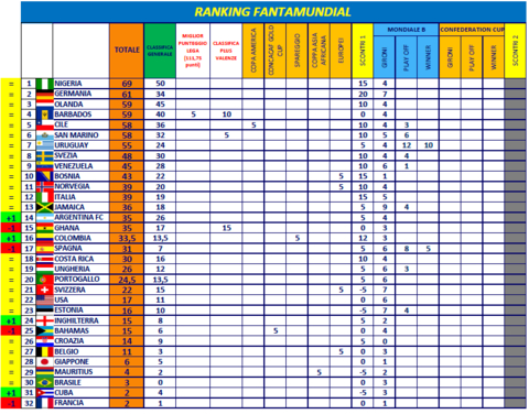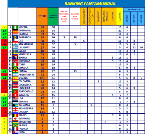 In testa troviamo la NIGERIA di Alberto che nonostante la sfortunata eliminazione al mondiale comanda saldamente la generale ed il Ranking con 69 punti..