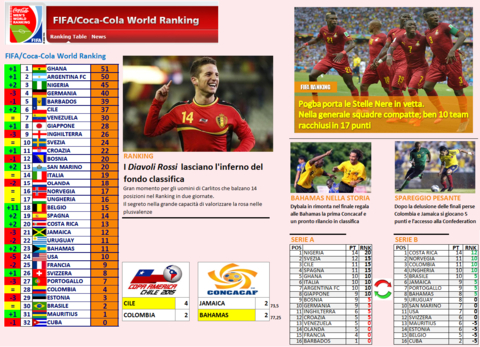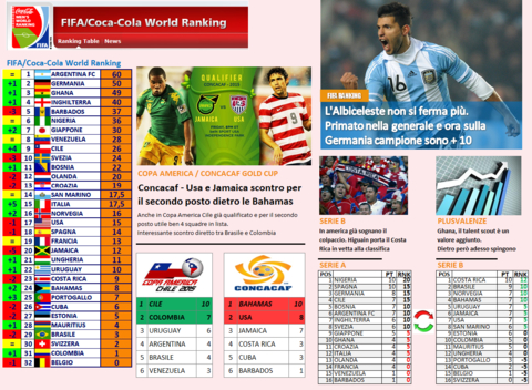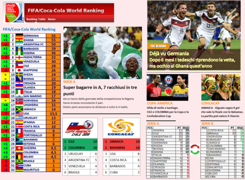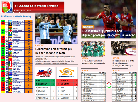 Importante risalita per il CILE che sull'onda dell'entusiasmo per la qualificazione alla finale di Copa america ha raggiunto la Top Ten arrivando al 9° posto.