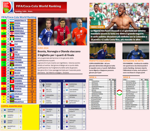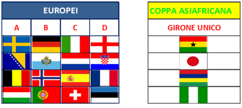 Ecco i gironi per gli Europei e la Coppa Asiafricana, per Euro2016 i gironi sono stati creati in base al Ranking...