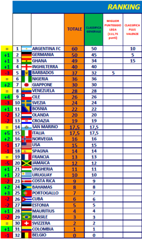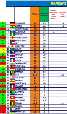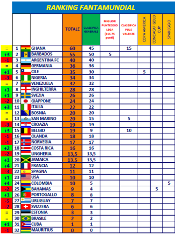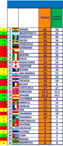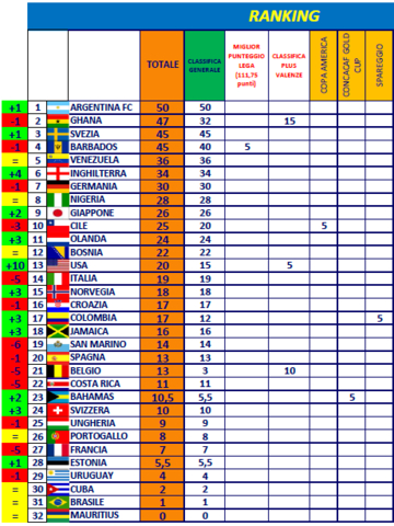 Sale al terzo posto il GHANA scopritore di talenti che approfitta della debacle delle BARBADOS che nelle ultime 2 settimane hanno perso tre posizioni e ora sono al 5° posto dietro l'INGHILTERRA.