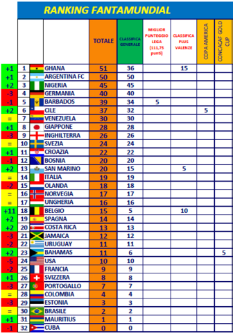 Dopo l'ultima giornata magra di gol la situazione in vetta resta quasi invariata con il GHANA che resta saldamente primo nel Ranking..