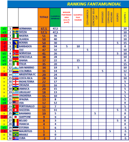 La Germania ritorna in testa con 67,5 punti grazie al primato nella classifica generale diviso con la Svezia che risale il Ranking fino al secondo posto con 57,5 punti...