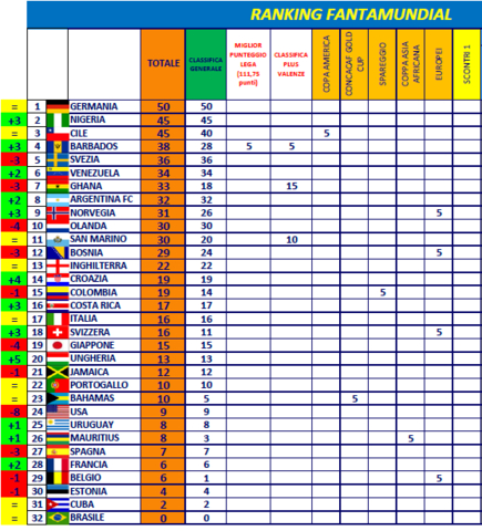 Quarto posto per il GHANA che scala una posizione e raggiunge i 37 punti grazie al connubbio tra classifica generale e...