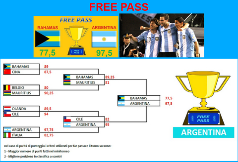 Al termine di un lungo torneo che ci ha visti impegnati per l'intera stagione l'ARGENTINA di Germano trionfa nella FREE PASS CUP sulle BAHAMAS di Traxdata...grande partita per l'albiceleste che marca alla perfezione gli uomini pericolosi dell'avversario e offende con Di Natale e soprattutto Ljajic appena rientrato...Questo è il primo vero titolo per l'Argentina da quando è nata la Fantamundial...
