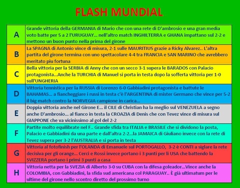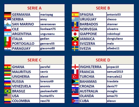 Questa settimana inizia anche il MONDIALE 2014 che avrà una struttura identica rispetto al mondiale vero, con la fase a gironi che durerà solo 3 giornate... come da regolamento i gironi sono stati creati in base al Ranking in modo da avere una specie di suddivisione in fasce con teste di serie...