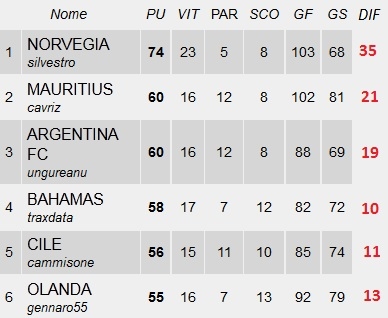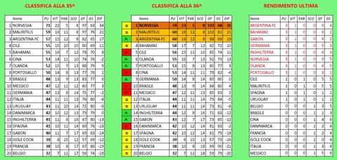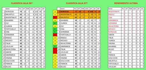 Le sfide di testa valide per il podio fanno segnare risultati decisivi...L'ARGENTINA supera le BAHAMAS e si garantisce un posto a podio. Attualmente è al secondo posto solitario infatti nell'altra sfida le MAURITIUS cadono contro la NORVEGIA che onorano fino in fondo il campionato e vincendo costringono le Mauritius ad attendere l'ultimo turno per centrare il terzo posto in una sfida a distanza contro le Bahamas...