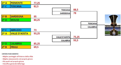 Quest'anno la finale sarà una lotta Centro - Sud.... Da un lato la Calabria di Silvestro che primeggia anche in campionato e ha disputato una gran coppa fin dalle prime fasi...dall'altra la Toscana di Gaetano che dopo essersi qualificata nel finale ha battuto avversari di spessore nella fase play off