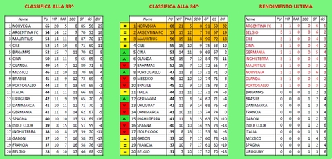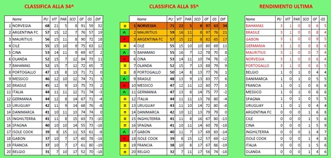 Dietro restano invariate le posizioni per ARGENTINA, MAURITIUS e CILE che vincono....solo CINA e OLANDA scavalcano le BAHAMAS sconfitte nell'ultimo turno...