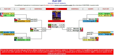 Miglior spettacolo non poteva esserci per la finale del Mundialito di chiusura, grande show tra la NORVEGIA di Silvestro e il BRASILE di Paolo...dopo il 6-2 dell'andata la partita sembrava chiusa e invece in questa gara di ritorno il BRASILE ha venduto cara la pelle trascinata da un super Cavani vincendo per 8-6 e chissà come sarebbe finita se Klose avesse trovato posto tra i titolari che cmq hanno siglato ben 7 reti.... vince dunque la NORVEGIA che segue la Cina nell'albo d'oro e chiude al meglio una fase play off dominata dall'inizio
