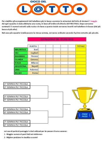 In home le modalità di stesura del calendario del FREE PASS, occhio alle estrazioni del lotto di domani 7 maggio....a domani per tutti gli altri aggiornamenti con una vittoria in anticipo!!
