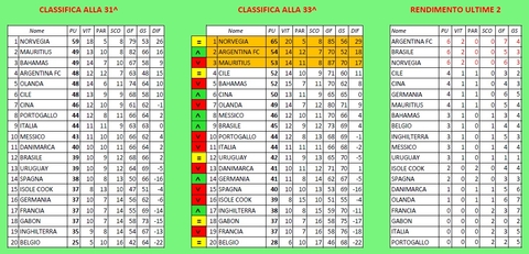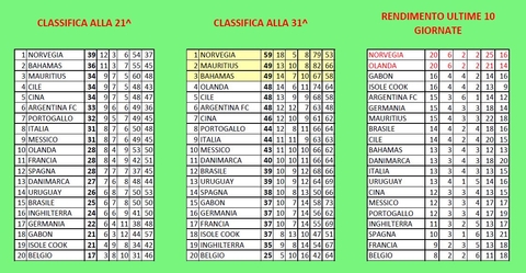 Classifica del campionato che a distanza di 10 giornate mostra molte posizioni pressocchè invariate, frutto di un andamento costante della maggior parte delle squadre...vengono all'occhio però il balzo in avanti dell'OLANDA di Gennaro che passa dalla posizione 10 alla 4 e l'allungo in classifica della capolista NORVEGIA che da +3 va a +10 sulle seconde a 7 giornate dal termine... Le due squadre infatti sono state quelle che nel corso delle ultime 10 giornata hanno collezionato più punti, ben 20...