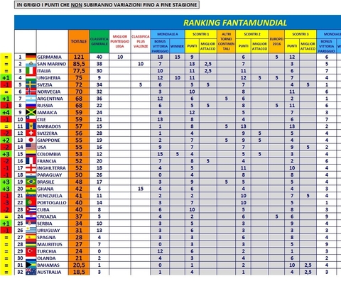 Ranking aggiornato alla 30^ giornata... ovviamente volano le squadre in corsa per il Mondiale.. su tutte la FRANCIA con +9 posizioni (7^)