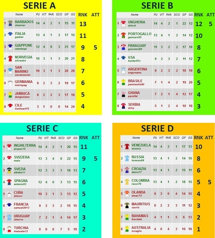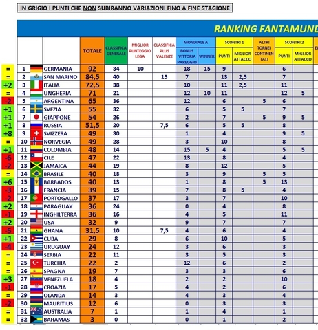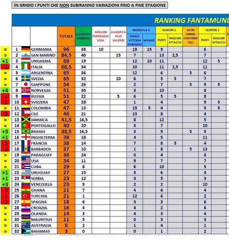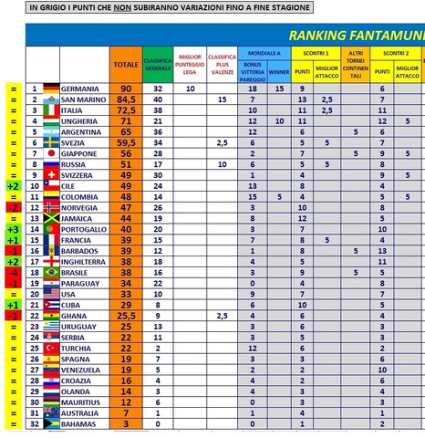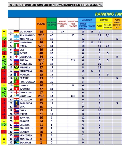Tra le migliori performance abbiamo la SVIZZERA che con i punti ottenuti dalla Serie sale otto posizioni e raggiunge la TOP TEN (9^). Anche le BARBADOS dopo la vittoria in Serie A ottenuta in rimonta incassa 13 crediti e si proietta in 15^ pos...