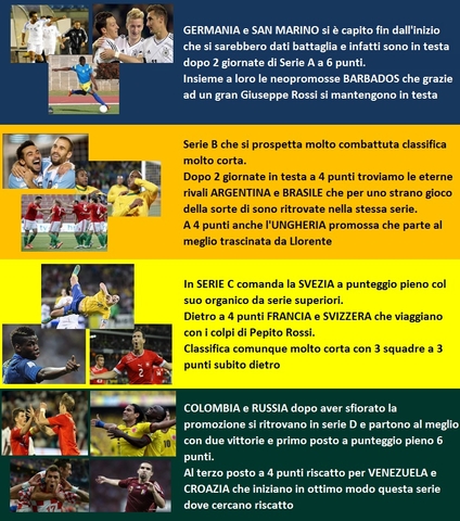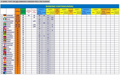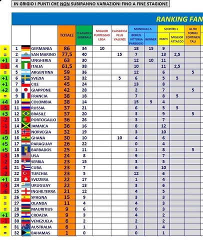 Ranking invariato nei primi 3 posti ma la GERMANIA perde altro terreno rispetto al SAN MARINO che ora è a una decina di punti..