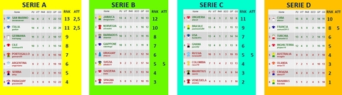 In SERIE B la JAMAICA porta a casa 12 punti nonostante la caduta all'ultimo turno; dietro la NORVEGIA che con una gran rimonta risale fino al secondo posto..chiudono il gruppo delle promosse BARBADOS e GIAPPONE..rammarico per la SVEZIA che si consola con i 5 punti del miglior attacco...