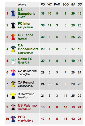 La Samp del DS Rizzo G. con un perentorio 3-0 sul Boca resta salda al comando della classifica ed è seguita dall'Inter di mr. Palma che, nonostante la cessione di Cassano e Mertens con l'arrivo di Palacio e Vucinic, non molla un centimetro ed affonda il Penarol di mr Rizzo E. (con il quale ha effettuato il doppio scambio in attacco) in piena crisi di risultati!
