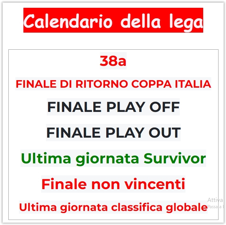Caipirinha,Cf2316,Biscio Granata,Hakuna Patata e DEA sono le 5 squadre che nell'ultima giornata di campionato si contenderanno il Survival:chi fara' piu' punti si portera' a casa l'iscrizione gratuita x la prossima stagione cosa che accadra' anche per il premio non vincenti che vedra' scontrarsi in finale Old Mask,che ha avuto la meglio su Mourtaccitua, e Marco Pantani che di qualche punto supera Atletico Navot. Sara' particolare che Tony e Marco da Salerno e Palermo si ritroveranno domenica al community day di Fantaclub a Catania.... Quasi chiuso il discorso Classifica Globale dominata da Fc ...