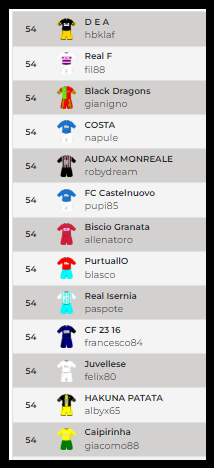 Ultime 13 formazioni rimaste in gioco per l'ultimate survival,nella prossima 37a giornata ne verranno eliminate altre 8 lasciandone in gioco solo 5 nella finale della 38a giornata.Per quanto concerne la classifica globale continua a guidarla Fc castelnuovo con margine su Costa mentre saranno Moutacci Tua-Old Mask Atletico Navot-Marco pantani le semifinali del premio NON VINCENTI. Il +2 casalingo salva dalla sconfitta in casa Fc Castelnuovo che impatta con Freddy68 in un pirotecnico 4-4 che lascia aperta ogni soluzione nella finale di ritorno della 38a giornata.In fatti la 37a giornata cedera' ...