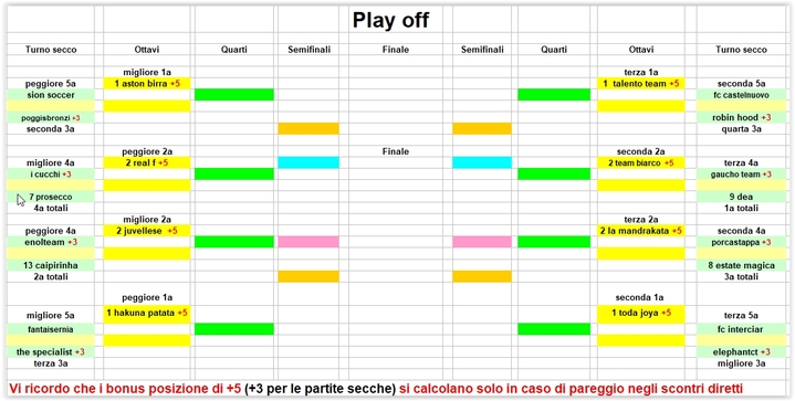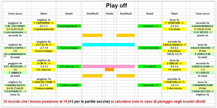 Si e' giocato il turno secco,i tabelloni sono stati aggiornati.Aggiunto l'assist a Ilicic,come da Gazzetta, e ricalcolati i risultati che ora sono ufficiali. Aggiunto il +3 alle formazioni meglio piazzate nei casi di pareggio,nei play off varia solo un risultato ovvero Audax Monreale-Lu Siestu. Audax Monreale fermo a 69,25 mentre con il +3 per la migliore posizione,applicato perche' la partita e' finita 1-1,Lu Siestu sale da 67,25 a 70,25 e quindi passa il turno perche' si resta sull'1-1 ma a quel punto Lu Siestu ha 1 punto in piu nei totali. Lu Siesto al tabellone play off mentre l'Audax Monr...