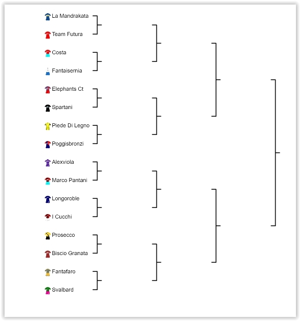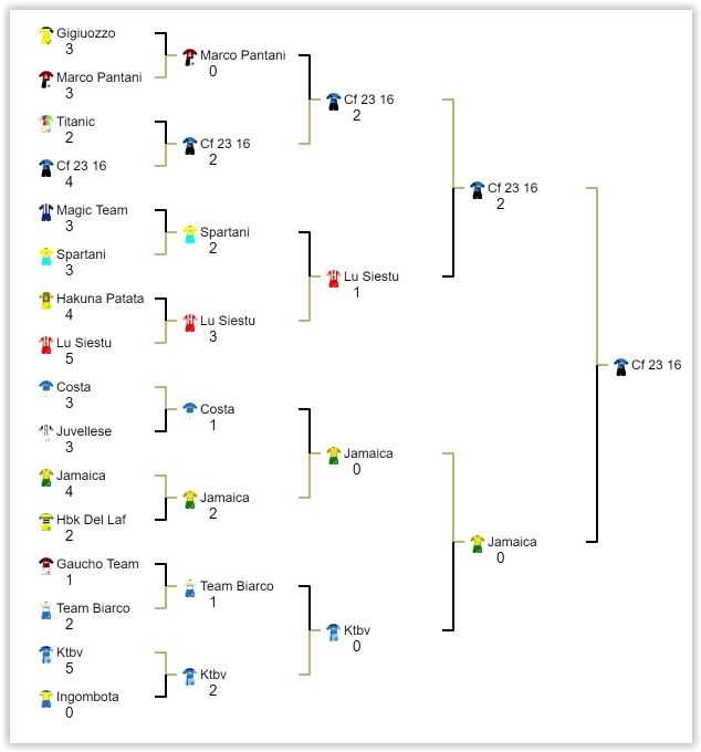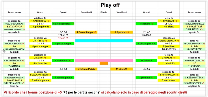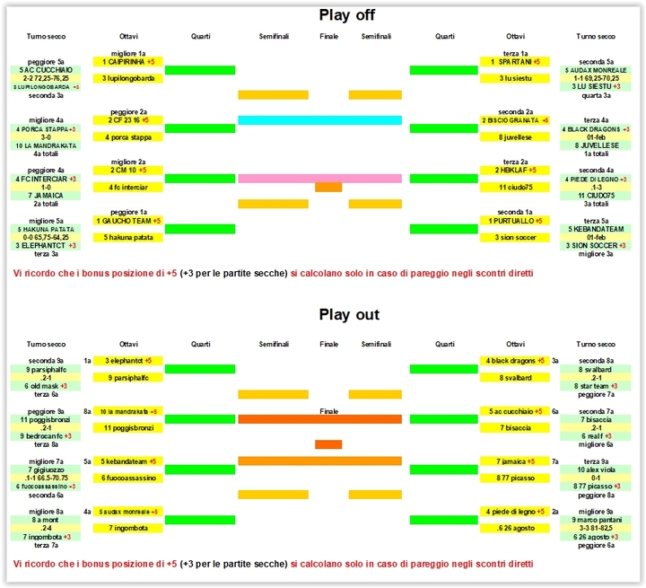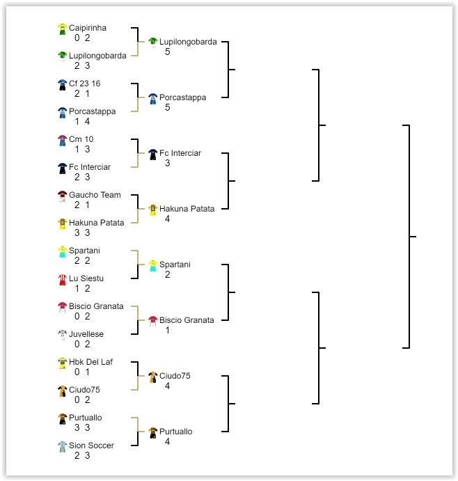 Ecatombe di teste di serie nella parte sinistra del tabellone dove vanno fuori entrambe le prime,Caipirinha e Gaucho Team, ed entrambe le seconde ovvero Cf2316 e Cm10. Nella parte destra invece cade a sorpresa Hbklaf estromesso da Ciudo qualificatosi per i totali dai gironi,ma avanzano Spartani e Purtuallo,due prime, e Biscio Granata,2a. A far loro compagnia nei quarti troveremo Porca Stappa,Hakuna Patata,Lupilongobarda e Fc Interciar.Cadono 4 teste di serie anche nei play out dove ElephantCt se la vedra' con Poggisbronzi e il Kebandateam contro Ingombota. Black Dragons-Bisaccia e 77picasso-Pi...